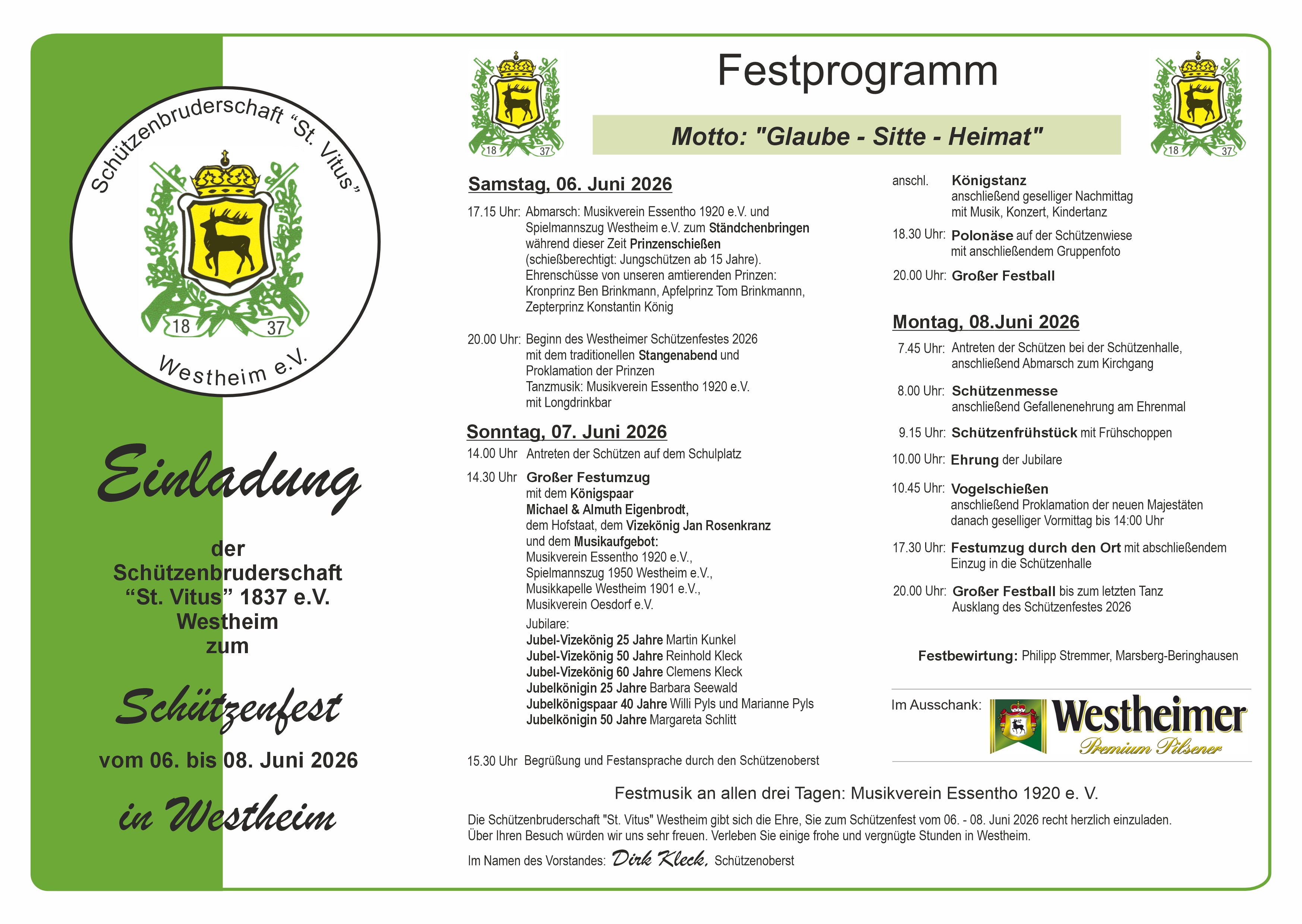 Die Westheimer Schützen feiern vom 6.-8.Juni ihr Schützenfest. Als Festmusik konnte wieder der Musikverein Essentho gewonnen werden, musikalisch wird das Fest vom Spielmannszug Westheim, der Musikkapelle Westheim sowie dem Musikverein Oesdorf begleitet und die Schänke liegt in den Händen von Philipp Stremmer und seinem Team aus Beringhausen.